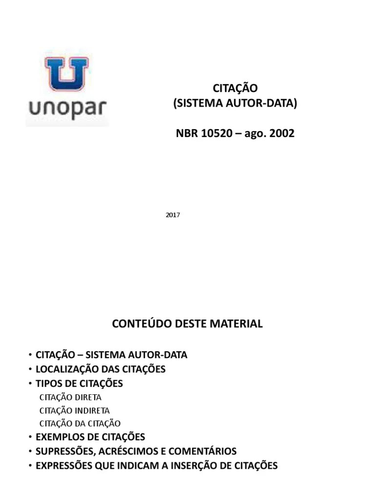 Se estiver no seu computador pessoal utilize o vpn. 2014 1 para acessar as normas da abnt: Assim, quando está referenciando uma frase de outro autor na sua obra, é útil usar uma citação direta. Quando estiver entre parênteses, o sobrenome do autor deve estar em maiúsculas. As aspas simples servem para introduzir citações dentro de uma citação O espaçamento das entrelinhas da citação deve ser simples; Modelos de citação com base nas normas da abnt este documento é apenas um resumo dos casos mais comuns. Uma citação direta é a transcrição fiel do conteúdo de uma obra. Siga o passo a passo disponível no site da biblioteca unesp sorocaba > link: Veja um exemplo de citação direta:.. Consulte a norma abnt nbr 10520:2002 para visualizar todos os casos1.